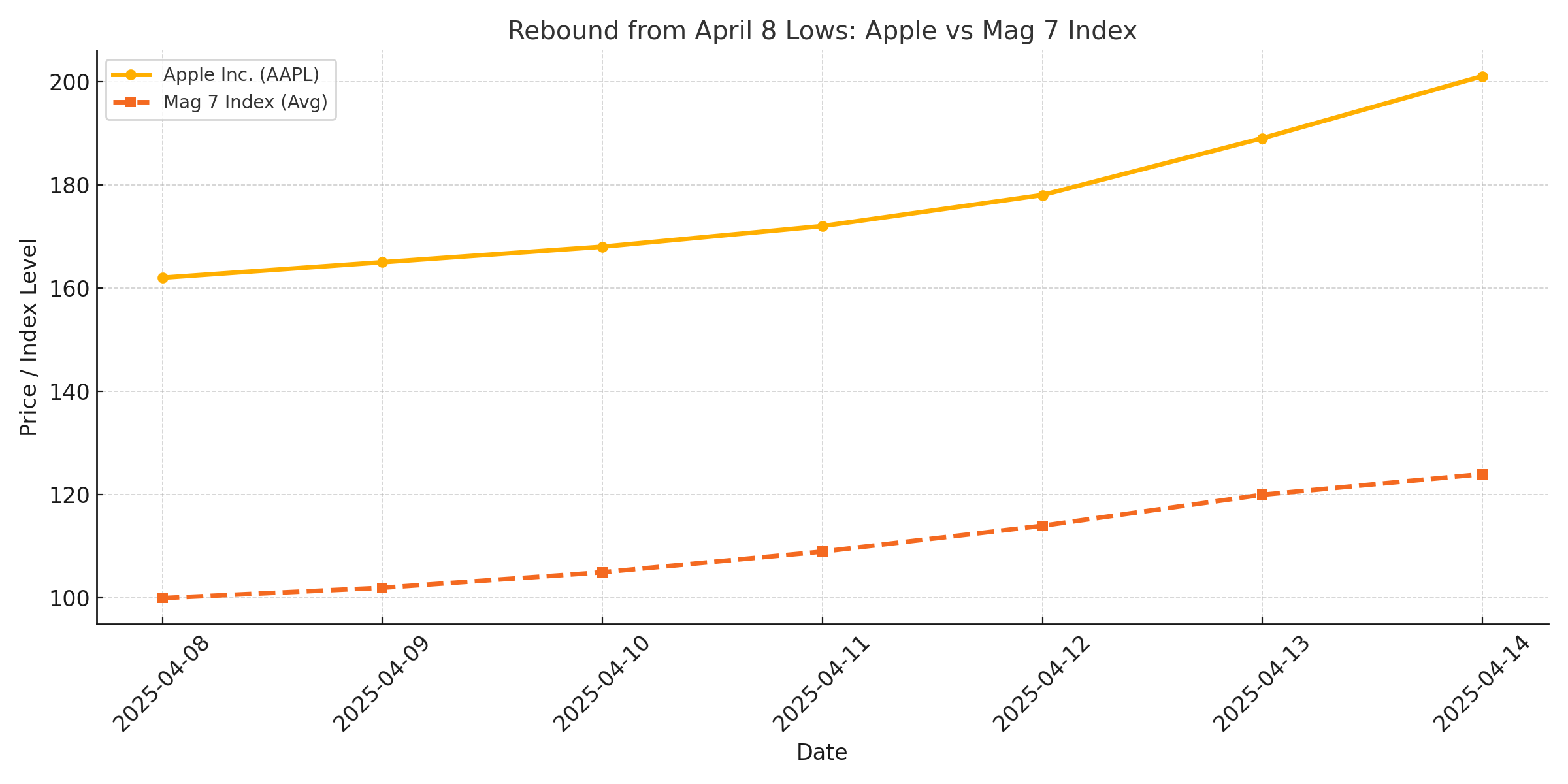 Let’s not dance around this. Apple is up 6.25% today alone after Trump announced a specific exemption for the company on Saturday — that’s not a rumour, that’s a straight-up policy edge. Since the low on April 8th, the stock has rallied 24%. That’s a $700B+ market cap bounce in a week, for those keeping score.